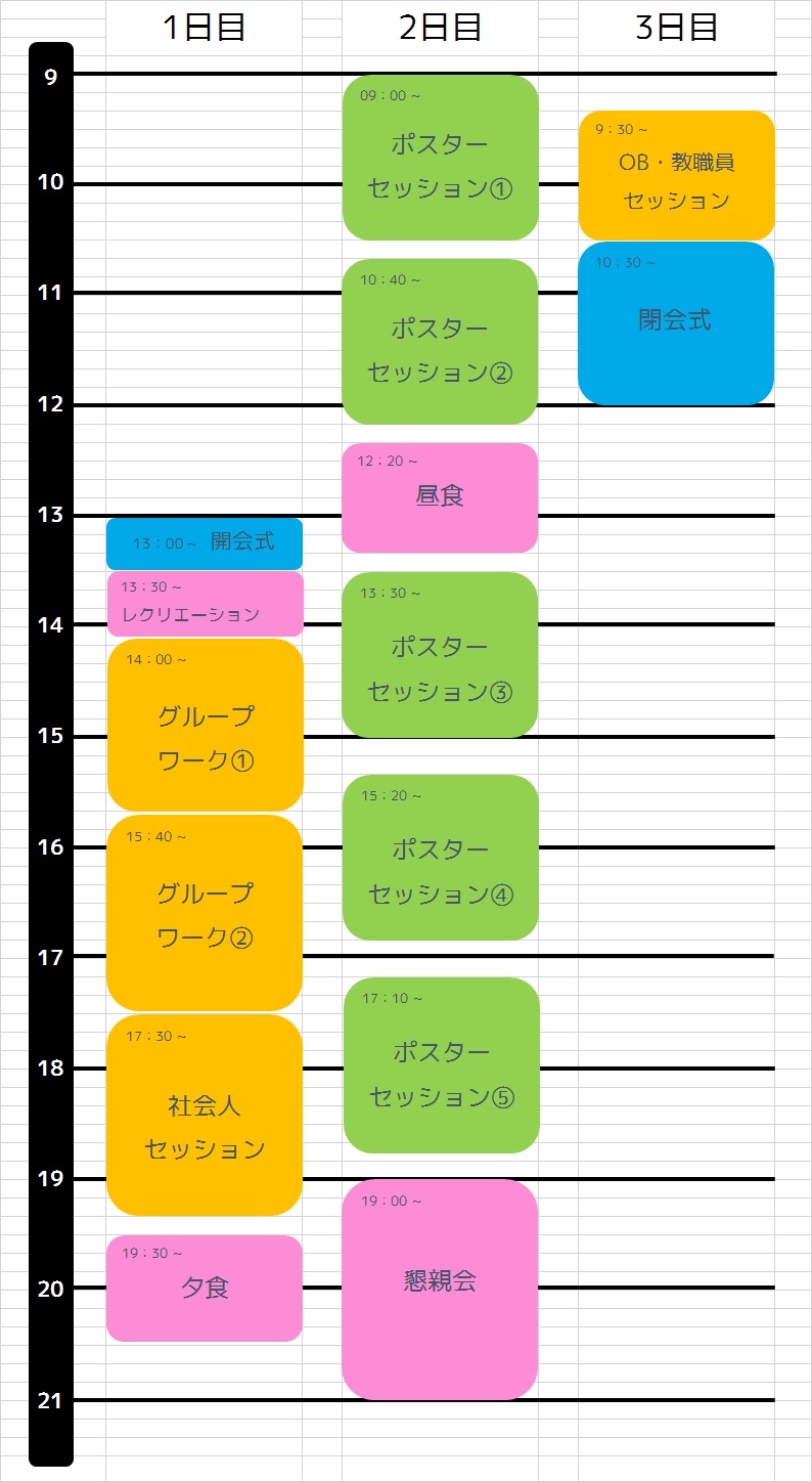全国の学生・教員、VIP合宿を経験したOB・OGの方々と自由に意見交換や議論を行える場です。1 セッション 90 分、前半と後半の 2 グループに分けて発表を行います(一人あたりの発表時間は 45 分)。これにより、発表者は自分と同じセッションのポスターも見ることができます。