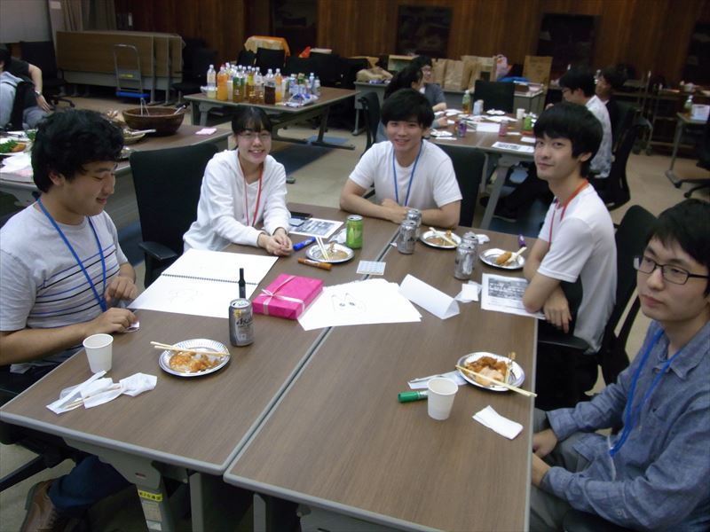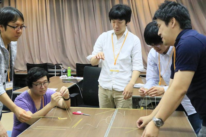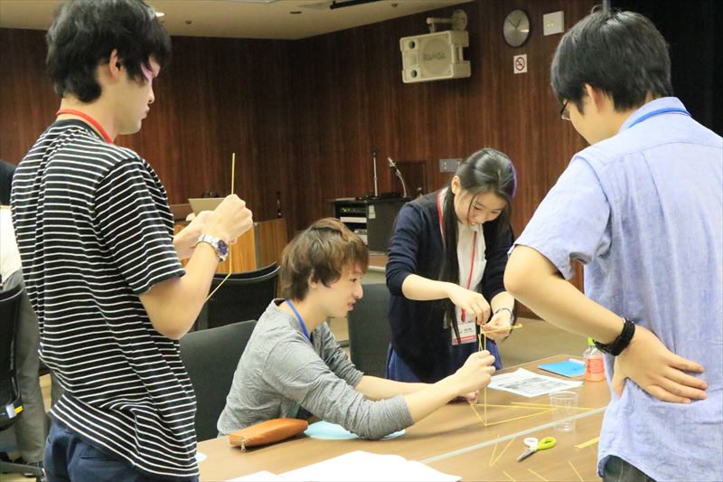 参加者には開会式の段階で5つのグループに分かれ着席してもらい、まず積み木式自己紹介を行ってもらいました。また、乾麺のパスタ、テープ、ひも、マシュマロを使って自立可能なタワーをたてる「マシュマロ・チャレンジ」に挑戦していただきました。初対面の参加者同士にも関わらず積極的な交流が行われ、大いに盛り上がったアイスブレイクになりました。