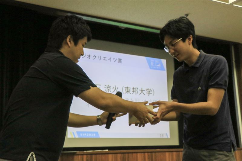 今年度も参加者による投票の結果を基に贈呈する「VIP Award」、および協賛企業の株式会社ウサギィ様より贈呈される「ウサギィ賞」、株式会社ジオクリエイツ様より贈呈される「ジオクリエイツ賞」の計3部門で表彰を行いました。 受賞された方には表彰状と記念品がそれぞれ贈られました。受賞者は以下の通りです。